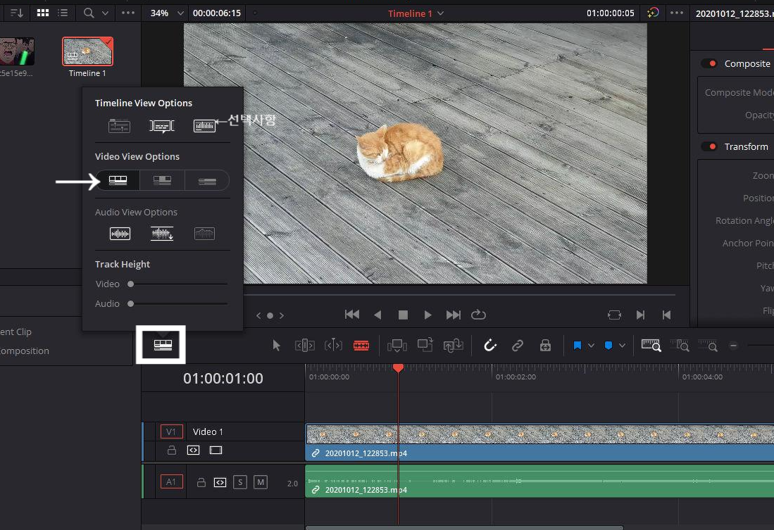 보기옵션은 타임라인 좌측상단에 있습니다. 버튼을 눌러서 동영상 보기옵션을 바꿔주고 바꾸는 김에 소리도 음파가 보이도록 옵션을 설정해줍시다.